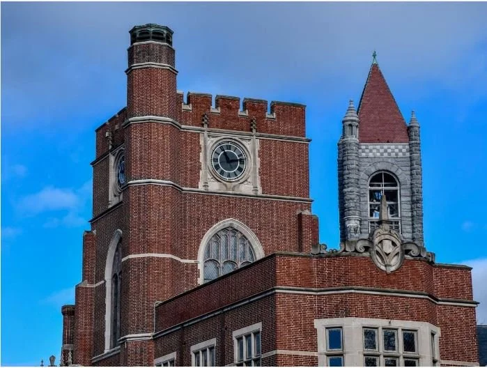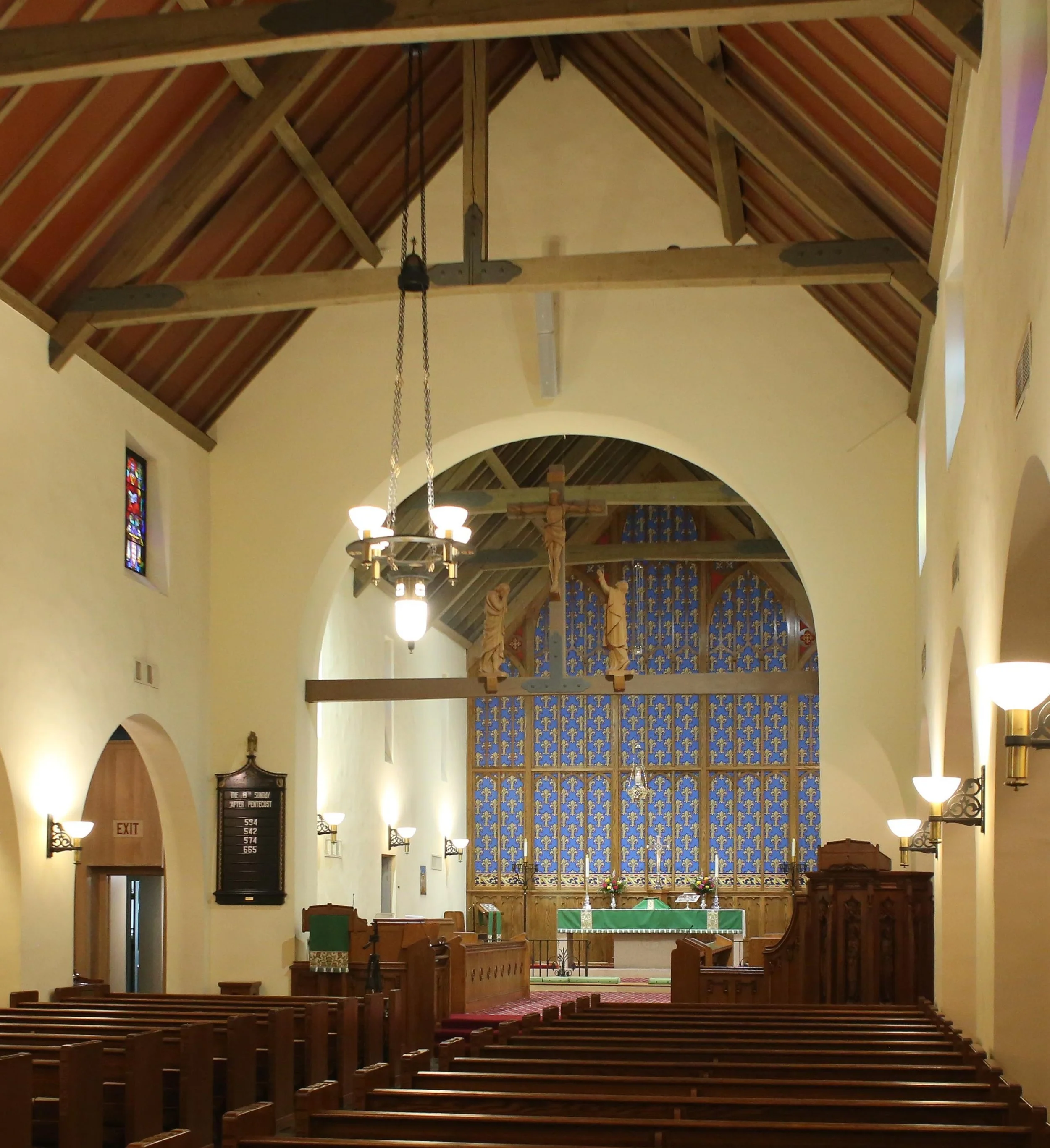 Grace Episcopal Church’s elegantly simple interior is focused on an open Gothic organ screen that fills almost the entire wall behind the altar. Cram and Ferguson were commissioned to create a colorful pattern for new acoustically transparent fabric to replace the existing dull grey cloth infill. The new design serves as a fitting backdrop for services in the chancel and gives depth to the interior with its blue background, embellished with a pattern of gold fleurs-de-lys and red accents.